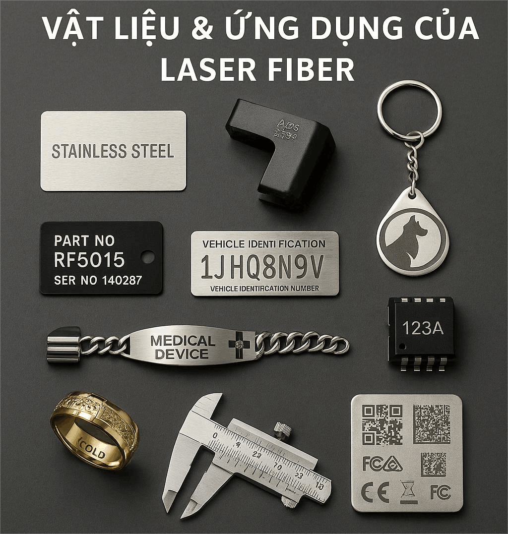 Kim loại: Máy khắc laser sợi quang , nổi tiếng với độ chính xác cao, hiệu quả và chất lượng chùm tia tuyệt vời, có thể khắc hầu hết mọi loại kim loại, bao gồm thép không gỉ, nhôm, thép, sắt, nhôm anodized, magie, chì, kẽm và đồng.