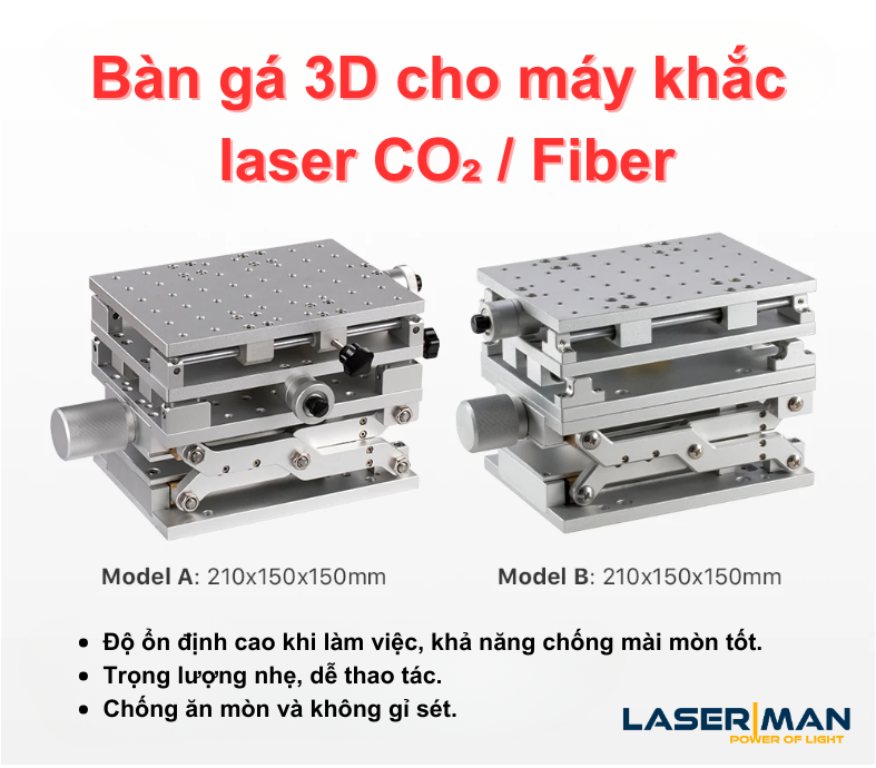 → Bàn gá 2D chỉ điều chỉnh được theo trục X/Y, còn bàn gá 3D cho phép điều chỉnh thêm trục Z (nâng hạ), giúp thao tác linh hoạt hơn với nhiều loại phôi có độ dày/chiều cao khác nhau.
