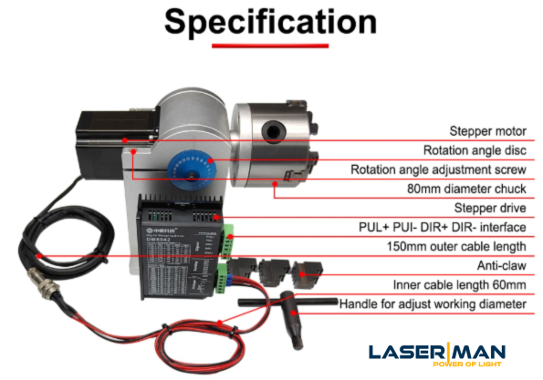 👉 Có, bàn xoay này tương thích với máy khắc laser Fiber, UV và CO₂, miễn là máy hỗ trợ kết nối trục xoay (rotary axis).