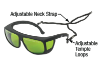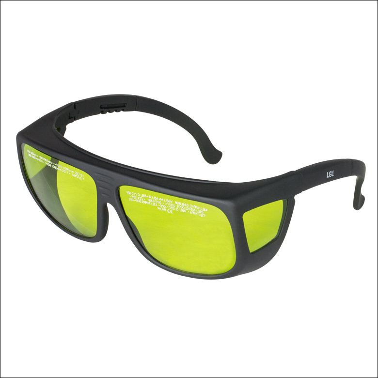 Kính bảo hộ kiểu dáng hiện đại có dây đeo có thể điều chỉnh, miếng đệm để tạo độ kín khít quanh mắt, cũng như các lỗ thông hơi giúp chống mờ sương. Kích thước bên trong của kính bảo hộ laser này là