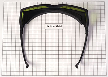 133 mm x 51 mm. Chiều dài đường chéo của tròng kính là 66 mm. Kính bảo hộ an toàn laser được trang bị miếng chèn có thể tháo rời cho tròng kính thuốc (vui lòng tham khảo ý kiến bác sĩ để lắp tròng kính thuốc cho miếng chèn). Xếp hạng an toàn laser được in không phai trên tròng kính để chỉ ra mức độ bảo vệ được cung cấp cho các dải bước sóng cụ thể.