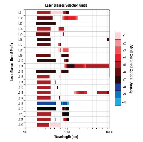 Mật độ quang học (OD) và Xếp hạng LB cho các dải bước sóng cụ thể được in không phai trên tròng kính hoặc gọng kính để nhận dạng vĩnh viễn mà không che khuất trường nhìn † . Để xem danh sách đầy đủ về mật độ quang học và Xếp hạng LB, vui lòng nhấp vào hàng tương ứng với từng mục # trong hướng dẫn lựa chọn bên phải.