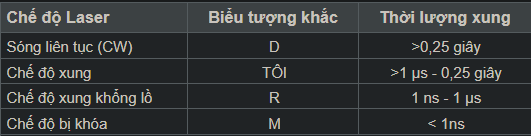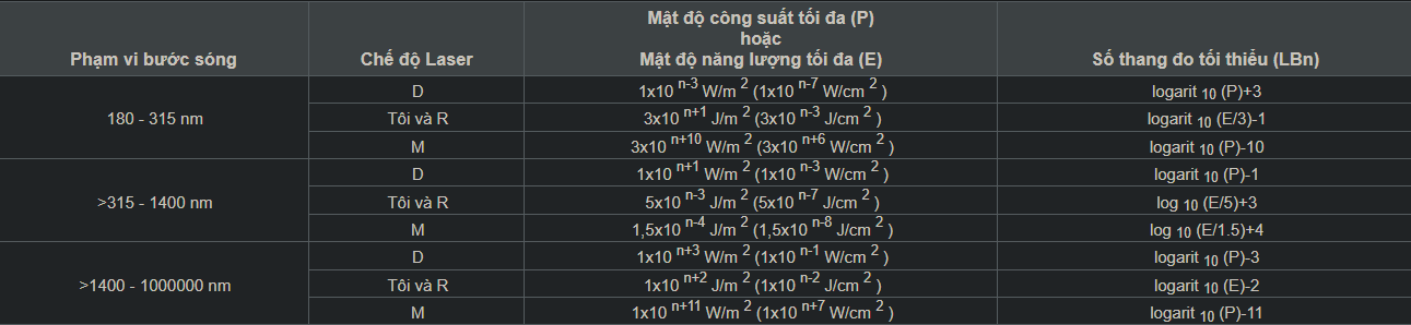 Ví dụ 2: Laser ion Krypton liên tục phát ra tia laser ở bước sóng 647,1 nm có mật độ công suất tối đa là 2,2x104 W / m2 . Sử dụng bảng trên, có thể tính toán số thang đo bằng công thức LBn=log10 ( P)-1, kết quả là số thang đo được làm tròn là 4. Kính an toàn laser LG4 đáp ứng các thông số an toàn của tiêu chuẩn EN 207 Châu Âu trong ví dụ này.