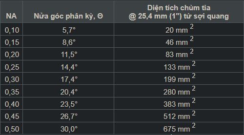 Khi làm việc với sợi quang, ánh sáng phát ra trực tiếp từ mặt đầu sợi quang sẽ phân kỳ. Do đó, mật độ công suất giảm dần khi chùm tia lan tỏa và nguy cơ gây tổn thương mắt cũng giảm dần. Bảng bên trái liệt kê diện tích chùm tia được tạo ra bởi ánh sáng thoát ra khỏi sợi quang đối với các sợi có khẩu độ số (NA) từ 0,10 đến 0,50. Nếu bạn biết tổng công suất phát ra từ sợi quang, bạn có thể tính toán mật độ công suất tại khoảng cách 25,4 mm (1") tính từ đầu sợi quang. Mật độ công suất này sẽ cho phép bạn xác định khoảng cách quan sát an toàn từ đầu sợi quang.
