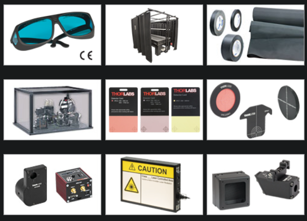 Cần lưu ý các biện pháp an toàn và sử dụng thiết bị an toàn đúng cách khi vận hành laser. Mắt rất dễ bị tổn thương, ngay cả khi chỉ tiếp xúc với cường độ ánh sáng laser rất thấp. Thorlabs cung cấp một loạt các phụ kiện an toàn laser có thể được sử dụng để giảm thiểu nguy cơ tai nạn hoặc thương tích. Phát xạ laser trong dải quang phổ khả kiến và hồng ngoại gần có nguy cơ gây tổn thương võng mạc cao nhất, vì giác mạc và thủy tinh thể trong suốt đối với các bước sóng này, và thủy tinh thể có thể tập trung năng lượng laser vào võng mạc.