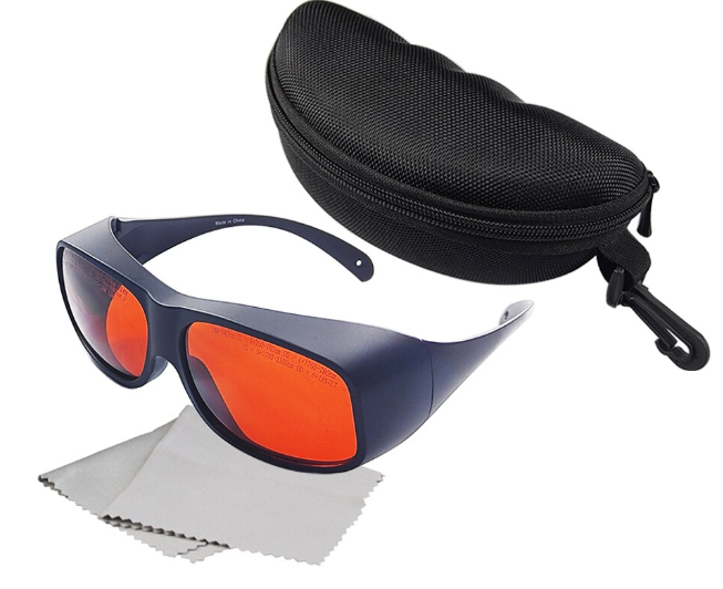 Kính đa bước sóng (180‑540nm & 750‑1100nm OD6+) – dùng cho cả UV, fiber laser, tròng cam và vỏ bảo vệ kèm hộp đựng