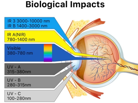 Laser từ 190–420nm (UV) ảnh hưởng trực tiếp đến giác mạc, nguy cơ gây viêm giác mạc, thoái hóa thủy tinh thể.