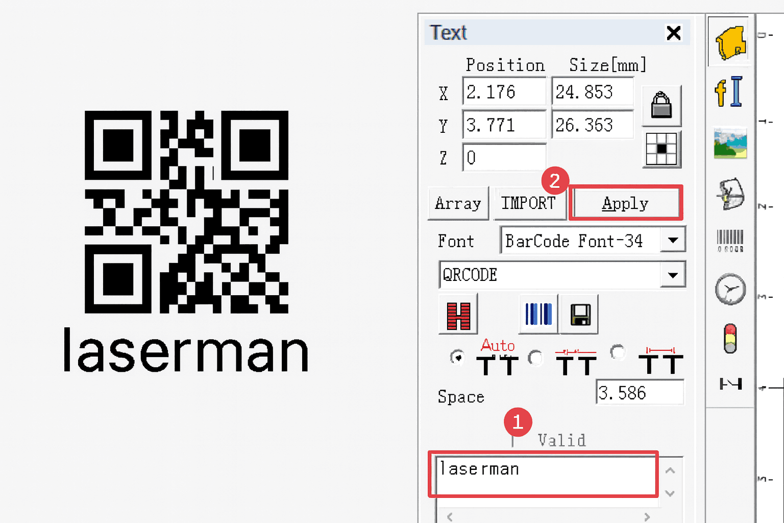 Lúc này, nếu bạn cần thêm từ hoặc số khác, hãy thay đổi văn bản trong hộp văn bản bên trái thành văn bản bạn cần để tạo mã QR. Ví dụ: nếu bạn muốn tạo văn bản "Laserman", hãy nhập "Laserman" vào hộp văn bản bên trái và nhấp vào Áp dụng.