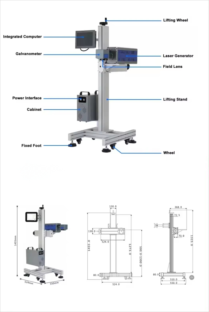 Máy khắc laser sợi quang Fly Online là một hệ thống khắc laser tiên tiến, được thiết kế cho việc khắc tốc độ cao trong môi trường công nghiệp, đặc biệt là trên các dây chuyền lắp ráp. Máy này có đầu laser có thể xoay, cho phép khắc từ nhiều góc độ, mang lại sự linh hoạt trong việc đánh dấu sản phẩm trong quá trình sản xuất.