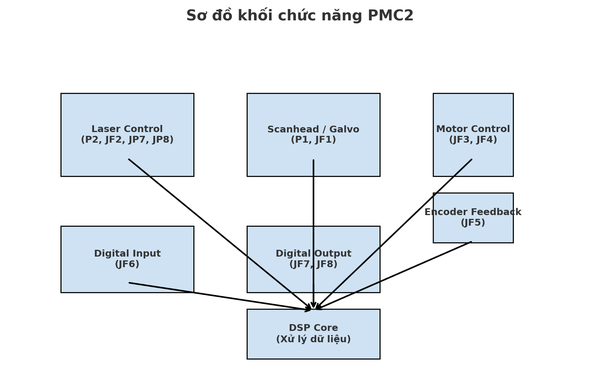 Hình minh họa sơ đồ khối chức năng PMC2: Laser Control – Galvo – Motor – Input/Output – tất cả hội tụ về DSP Core để xử lý.