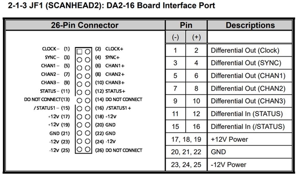 Chức năng: giao tiếp tới DA2-16 daughter board (hoặc galvo thứ 2/analog). Có cả nguồn ±12 V cấp cho board mở rộng.