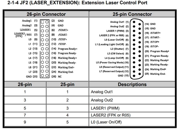 hình sơ đồ chân JF2 – Laser Extension & bảng ánh xạ 26↔25 pin