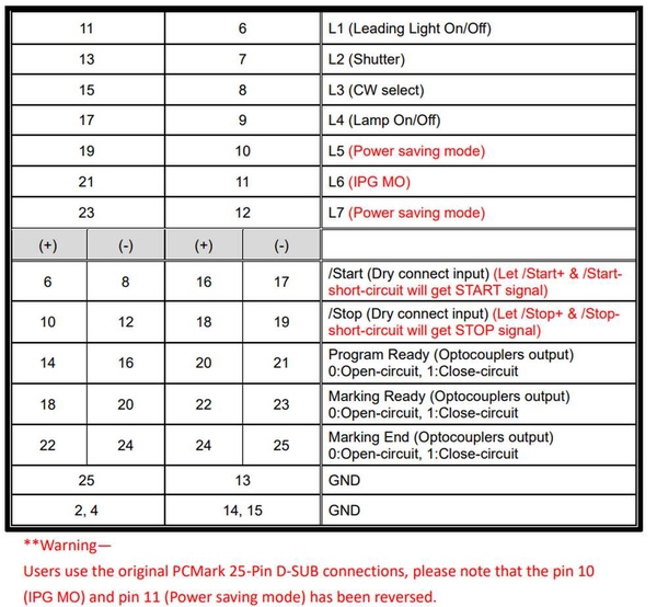 P2.21 (nếu ở đầu mở rộng) = Program Ready, P2.23 = Marking Ready, P2.24/25 = Marking End (ngõ optocoupler, mức logic: 0 = hở mạch, 1 = đóng mạch).