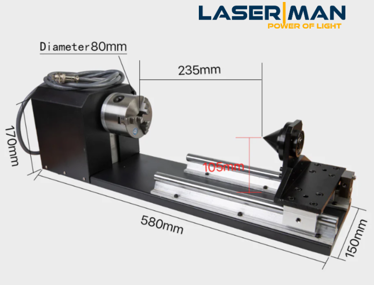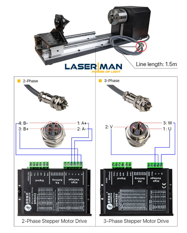 Rotary Axis được thiết kế chuyên dụng để khắc laser trên các sản phẩm trụ tròn, với chiều dài dây 1.5m, dễ dàng kết nối và vận hành ổn định.