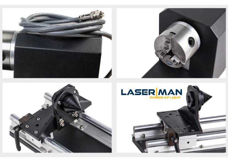 Rotary Axis thích hợp cho việc khắc laser trên các vật liệu tròn, trụ, hoặc sản phẩm có hình dạng đặc biệt như: