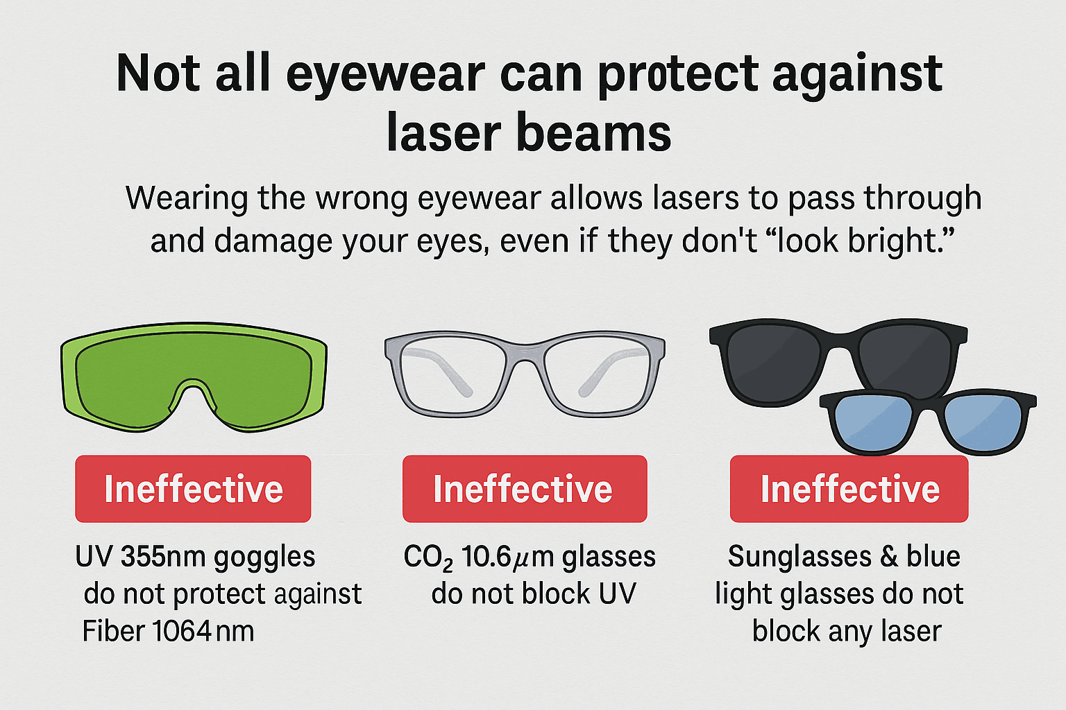 Không phải kính nào cũng bảo vệ được mắt khỏi tia laser – vì mỗi loại laser có bước sóng khác nhau, yêu cầu kính bảo hộ được thiết kế chuyên biệt. Nếu đeo sai kính, tia laser vẫn có thể xuyên qua và gây hại cho mắt, dù bạn cảm thấy “mắt không chói”.