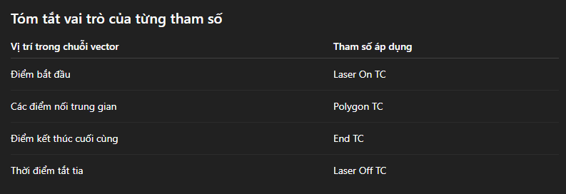 Polygon TC kiểm soát thời gian chờ tại các điểm nối giữa các đoạn vector liền nhau. Độ trễ này cần thiết để phần mềm đồng bộ với chuyển động thực tế của gương galvo tại các điểm chuyển hướng.