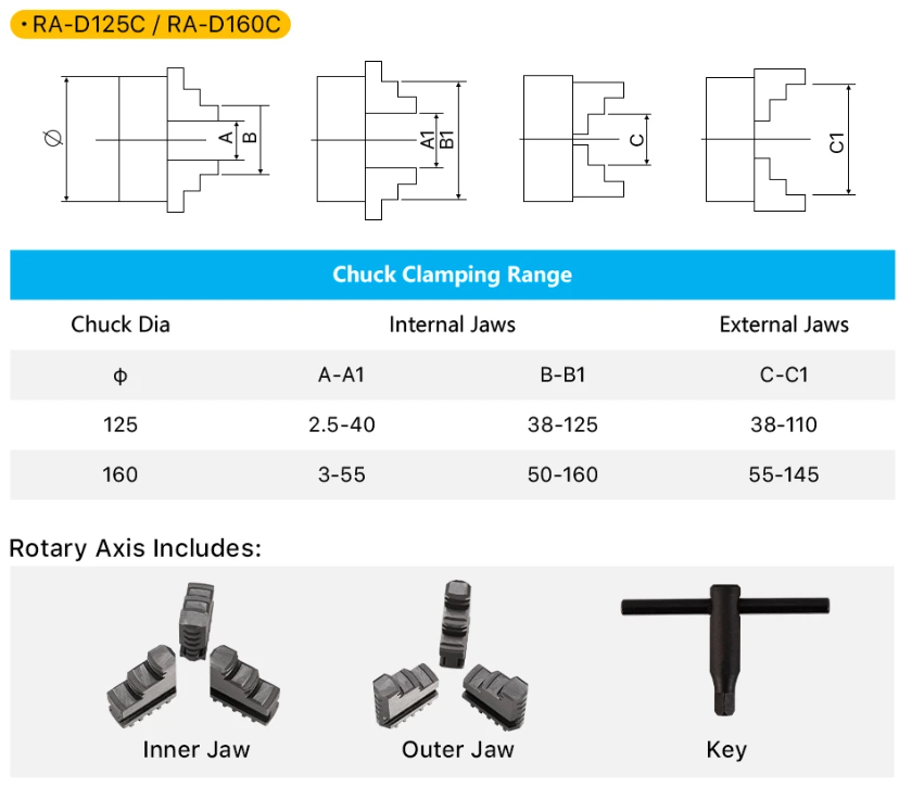 | Mâm cặp | Kẹp trong (mm) | Kẹp ngoài (mm) |
